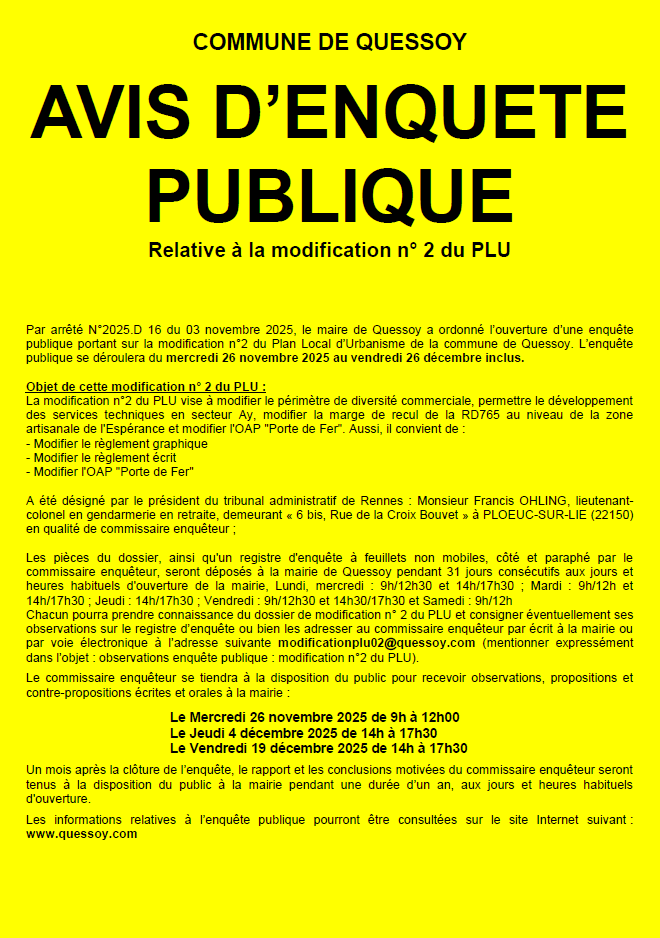 Par arrêté N°2025.D 16 du 03 novembre 2025, le maire de Quessoy a ordonné l’ouverture d’une enquête publique portant sur la modification n°2 du Plan Local d’Urbanisme de la commune de Quessoy.
